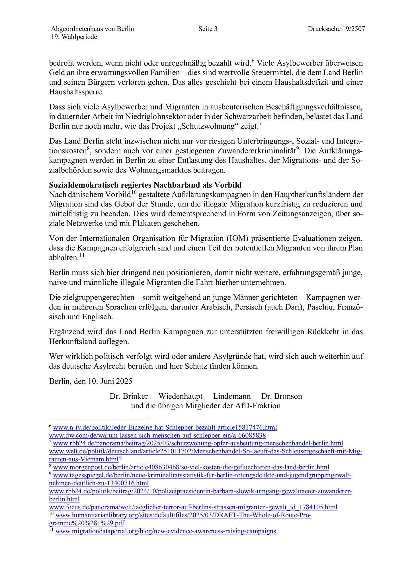 Die AfD-Hauptstadtfraktion hat einen Antrag ins Berliner Abgeordnetenhaus eingebracht, wonach das Land Berlin in den Herkunftsländern illegaler Migration Aufklärungskampagnen nach dänischem Vorbild durchführen soll.