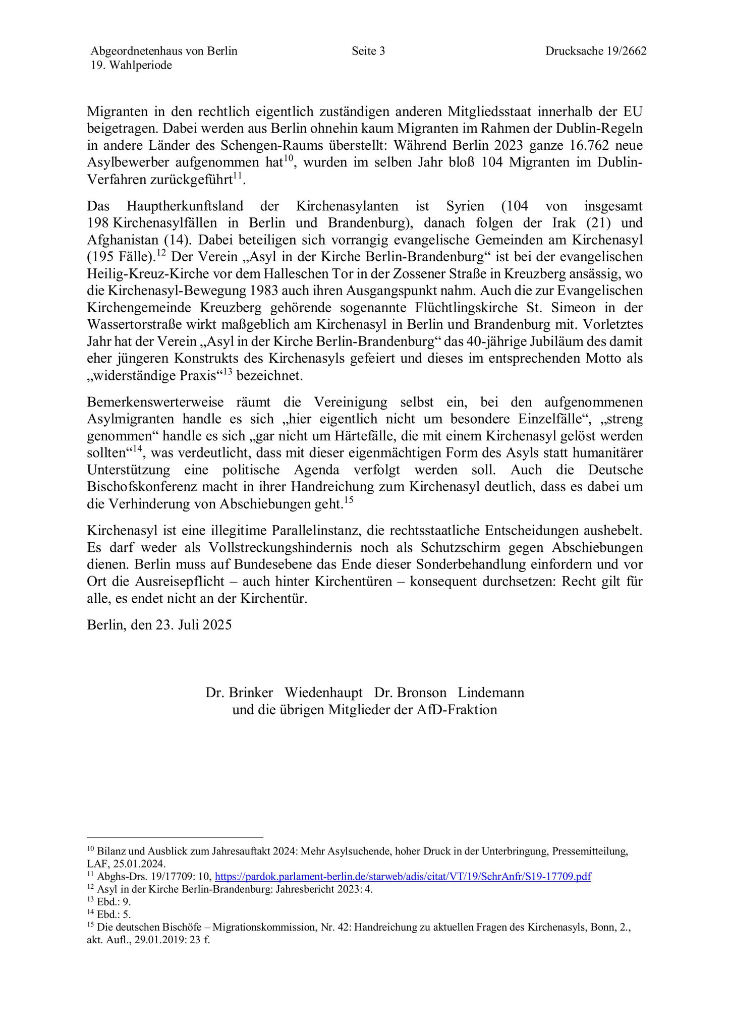 „Allein in Berlin hielten sich im Jahr 2023 rund 178 ausreisepflichtige Personen im Kirchenasyl auf, bundesweit waren es etwa 2000 Personen“, so Lindemann weiter. Die „Ökumenische Bundesarbeitsgemeinschaft Asyl in der Kirche e. V.“ mache unter der Losung „Gemeinsam Grenzen überwinden“ keinen Hehl daraus, dass sie negative Rechtsentscheidungen staatlicher Behörden und Gerichte über Asylanträge nicht respektiere und ausdrücklich das Ziel verfolge, „Flüchtlinge“ vor Abschiebung zu schützen.“