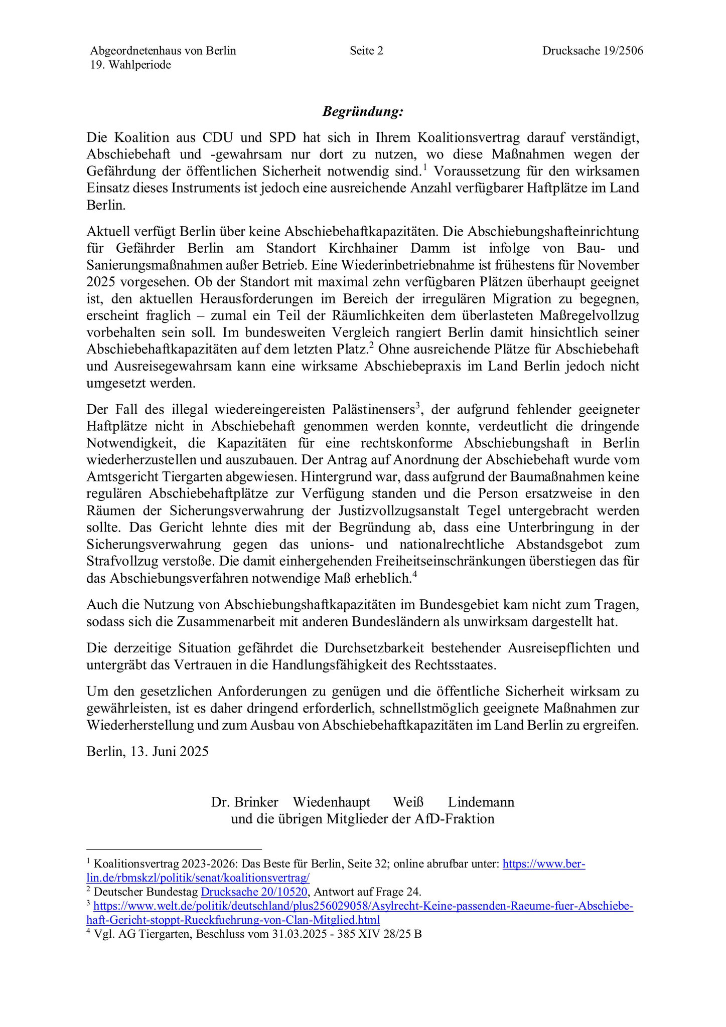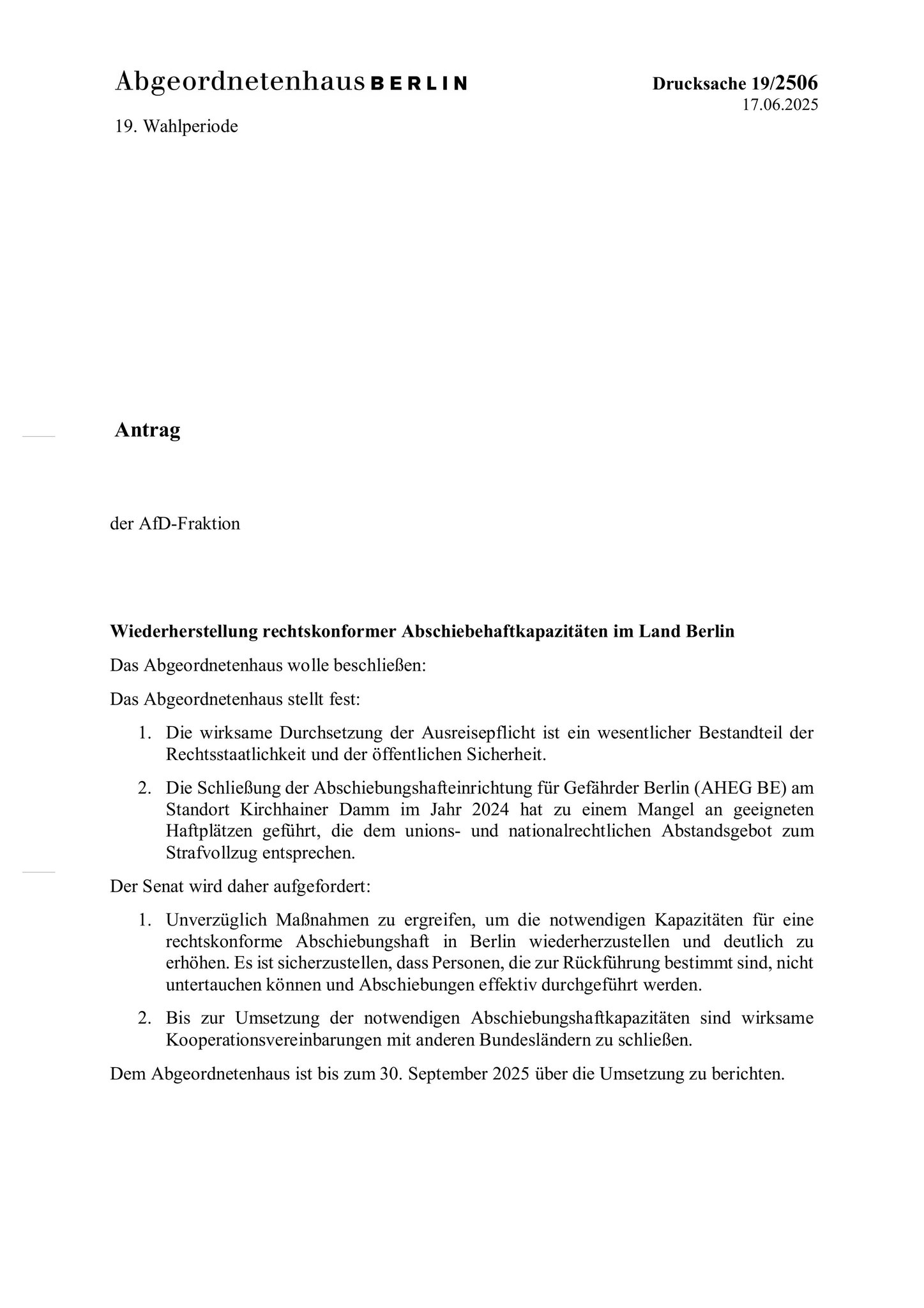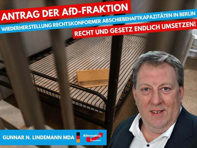 Die Fraktion der AfD im Berliner Abgeordnetenhaus hat einen Antrag eingebracht, in dem der Senat aufgefordert wird, die notwendigen Kapazitäten für eine rechtskonforme Abschiebehaft im Land Berlin wiederherzustellen.