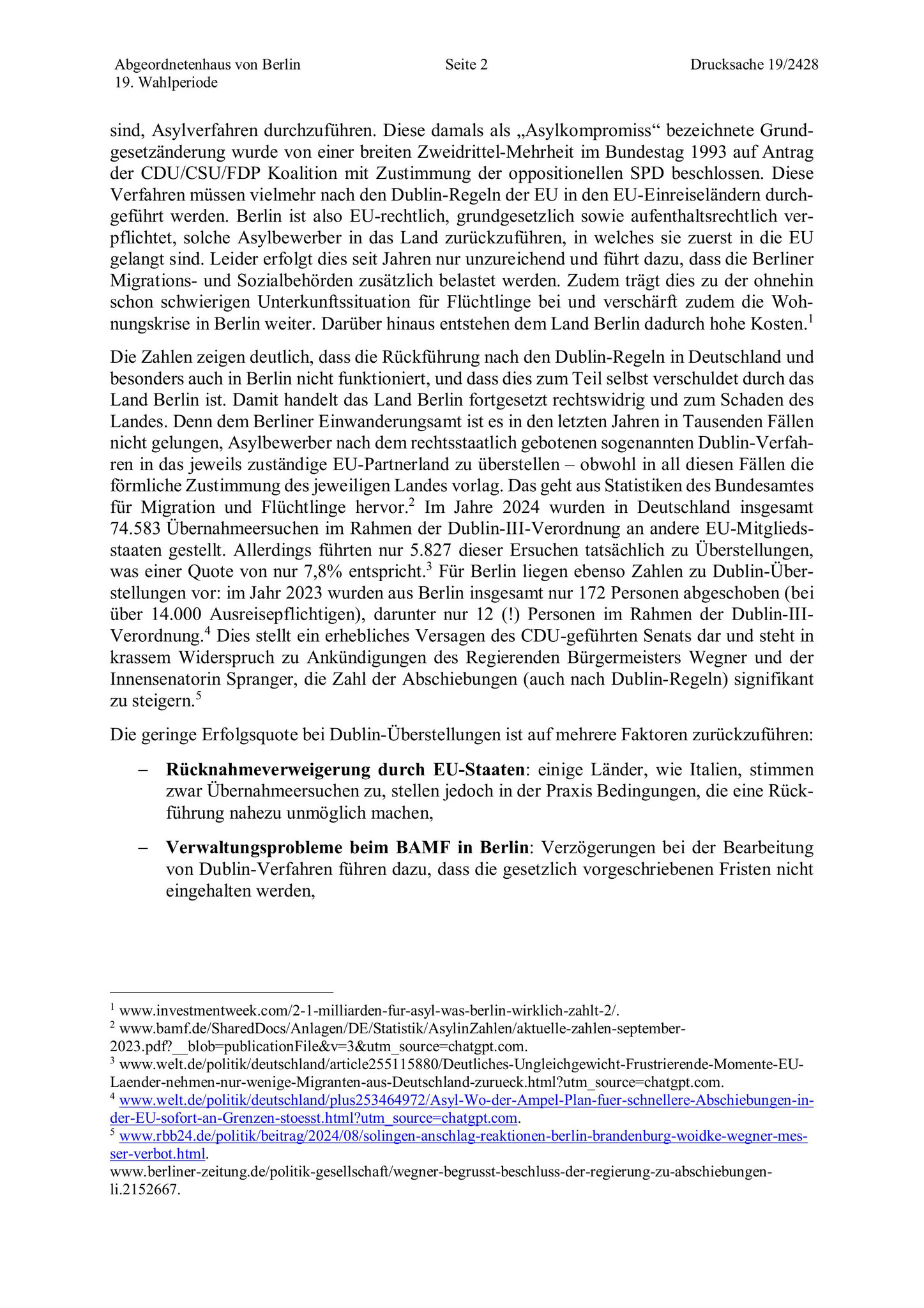 „Dublin-Abschiebezentren existieren bereits in Hamburg und Brandenburg.“ Eine derartige Einrichtung sei zum Schutz der Bevölkerung sowie zur finanziellen, wohnungspolitischen sowie der allgemeinen Entlastung der Behörden in der derzeitig migrationspolitisch sehr angespannten Situation auch in Berlin dringend erforderlich.