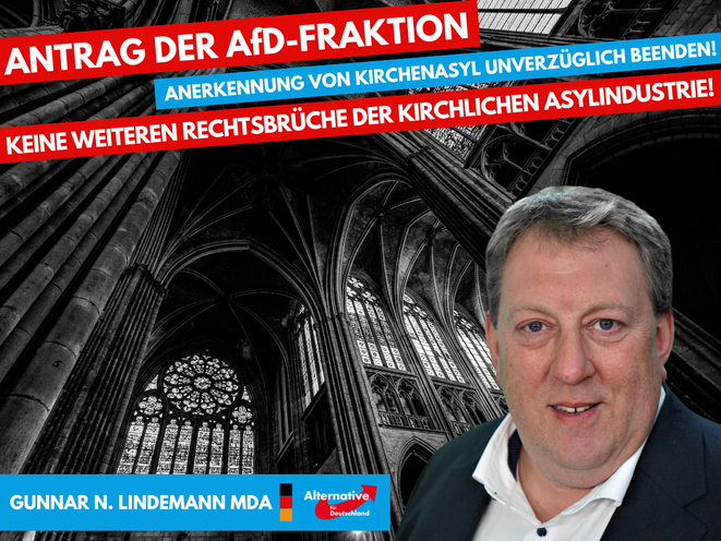 Die AfD-Fraktion im Berliner Abgeordnetenhaus hat einen Antrag eingebracht, wonach die staatliche Anerkennung des Kirchenasyls unverzüglich zu beenden ist. Der fachpolitische Sprecher für Migration, Gunnar Lindemann, teilt hierzu mit:
